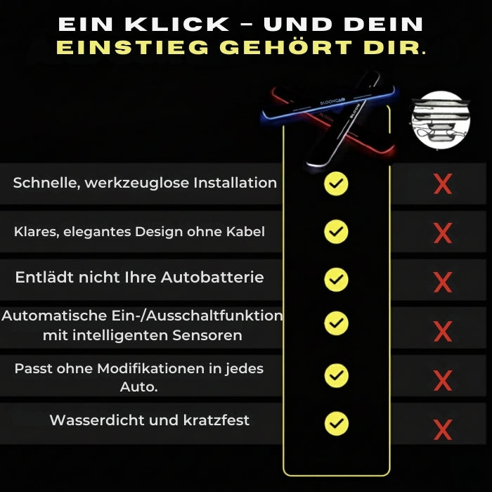 Die Leisten aktivieren sich automatisch, sobald die Tür geöffnet wird und erzeugen ein sanftes LED-Licht, das den Einstieg sichtbar und angenehmer macht.
